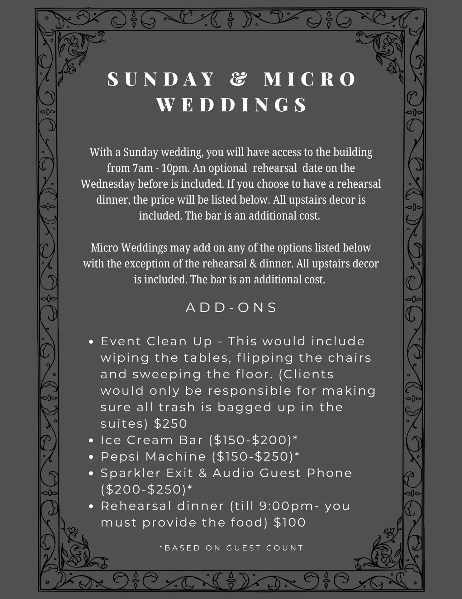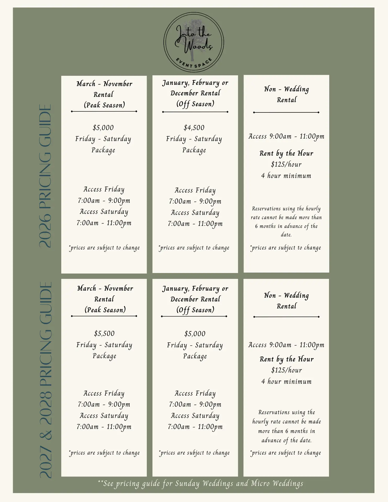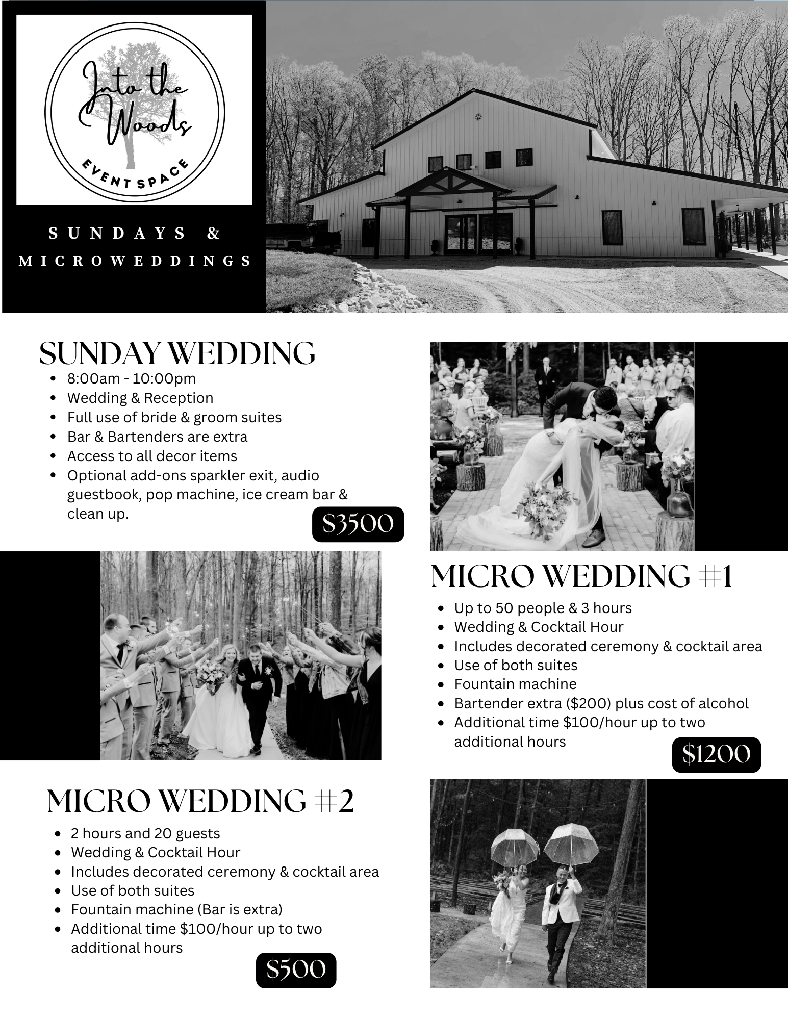 Pricing & Amenities Option 1: Choose a Friday/Saturday base or Non Wedding Rental Add on a Package! Option 2: Choose a Sunday or Micro Wedding Package **Micro Weddings are only for Sunday - Tuesday. Wednesday - Saturday can only be booked if it is less than 6 months before the date. Customize your Sunday Package! Have Any Questions? FAQ's How many guests? 300+ Can we choose our own vendors? Yes – with the exception of bartenders. You must use our bartenders. Are there outdoor areas? Yes! We will have an outdoor fire pit lounge area for guests to relax outside in our private woods. Is your space wheelchair accessible? Yes, all areas of our venue are wheelchair accessible and ADA compliant.
