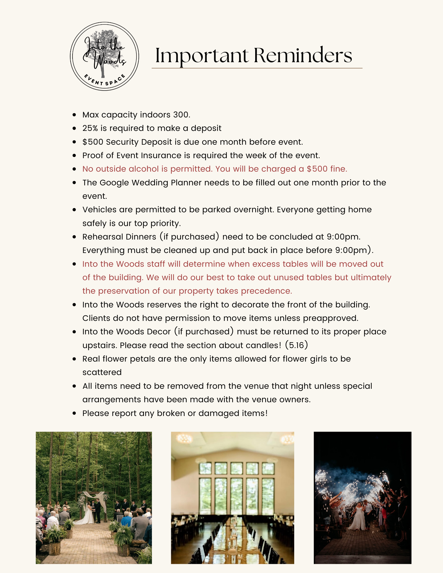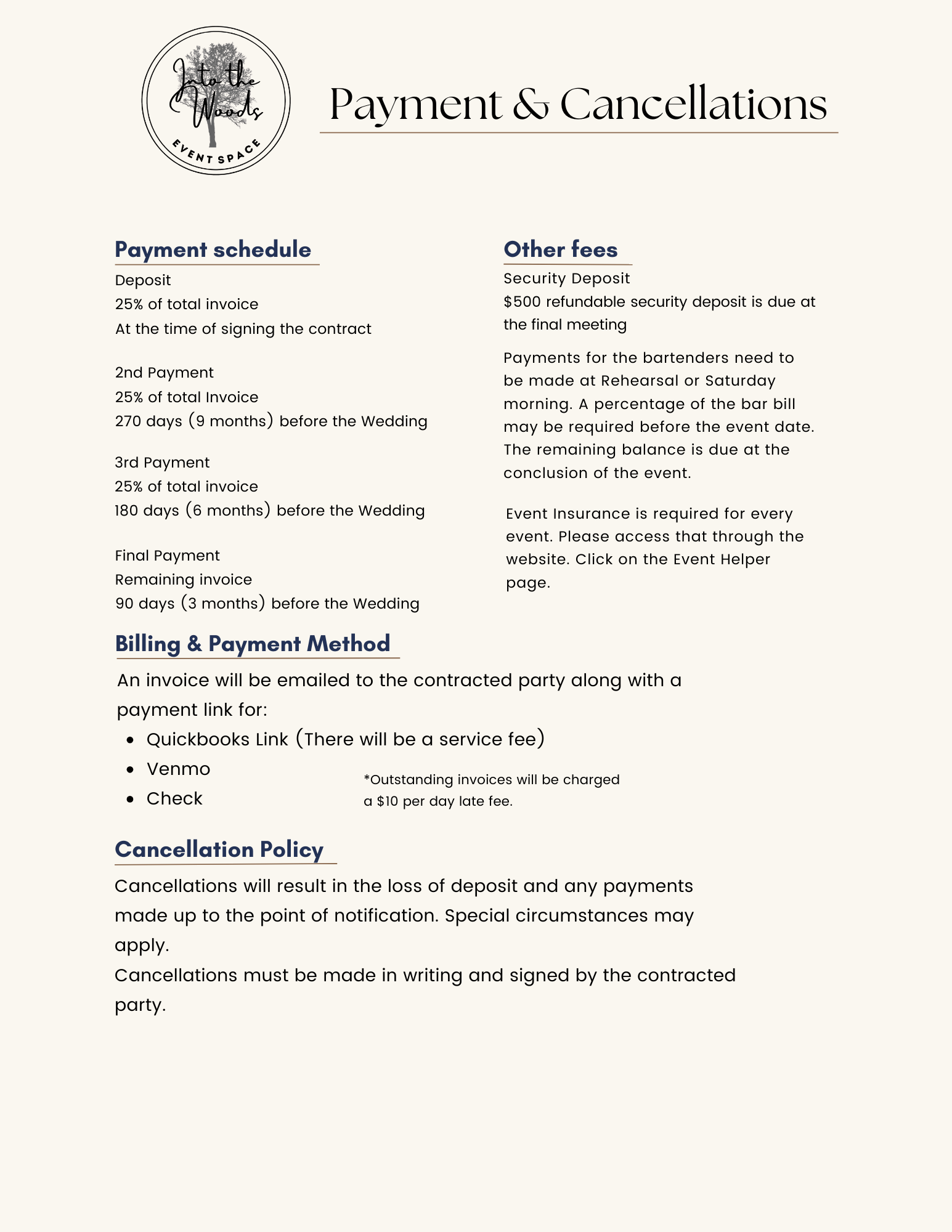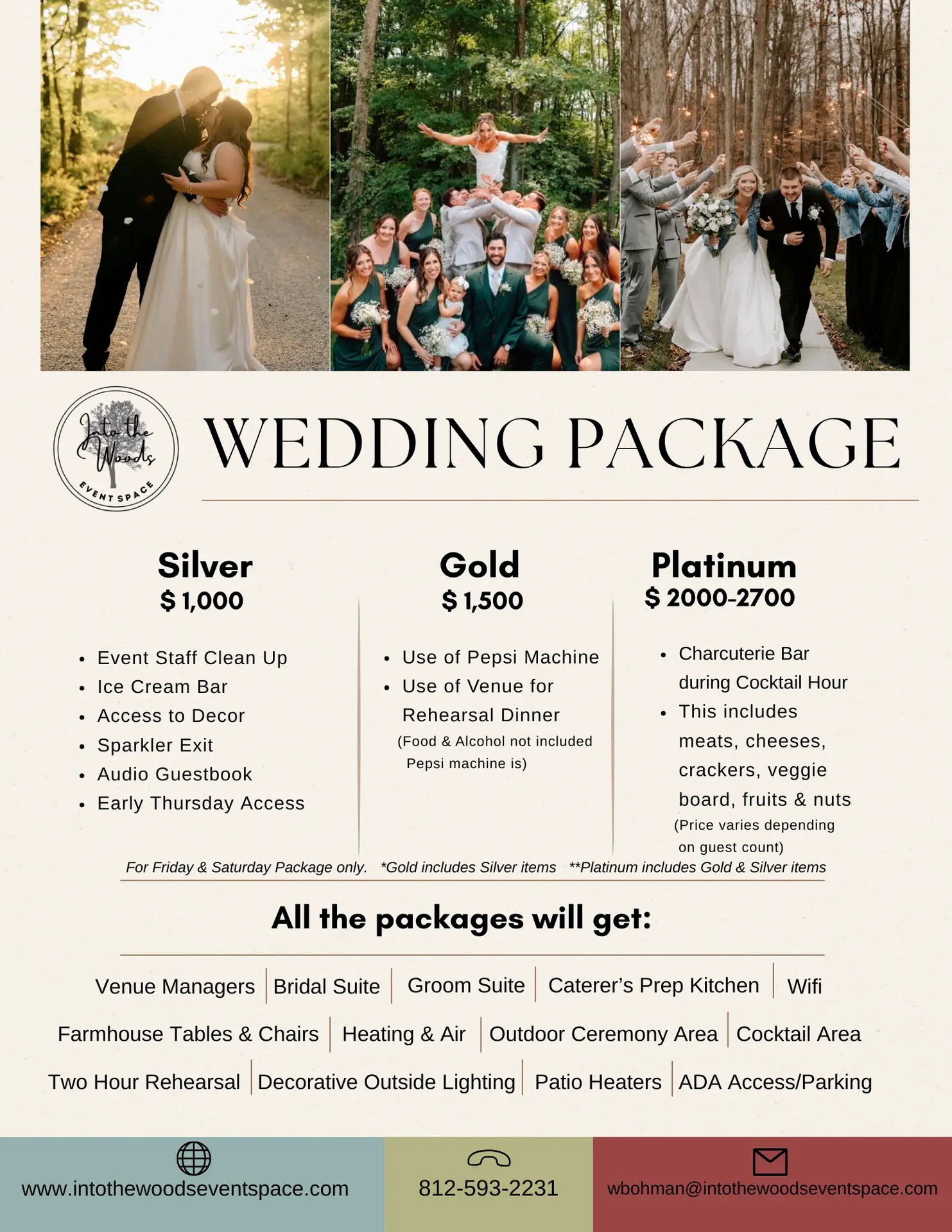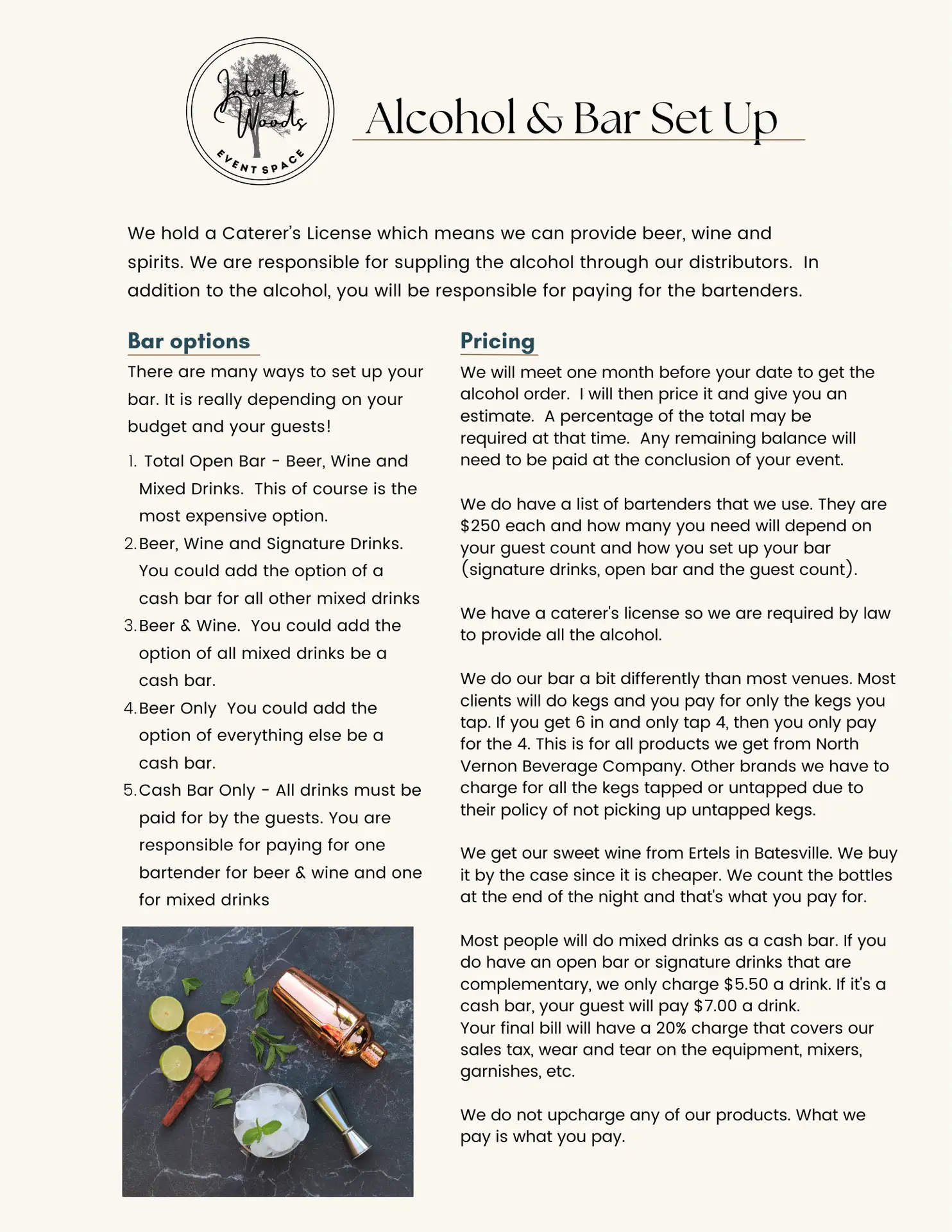 Pricing & Amenities Option 1: Choose a Friday/Saturday base or Non Wedding Rental Add on a Package! Option 2: Choose a Sunday or Micro Wedding Package **Micro Weddings are only for Sunday - Tuesday. Wednesday - Saturday can only be booked if it is less than 6 months before the date. Customize your Sunday Package! Have Any Questions? FAQ's How many guests? 300+ Can we choose our own vendors? Yes – with the exception of bartenders. You must use our bartenders. Are there outdoor areas? Yes! We will have an outdoor fire pit lounge area for guests to relax outside in our private woods. Is your space wheelchair accessible? Yes, all areas of our venue are wheelchair accessible and ADA compliant.